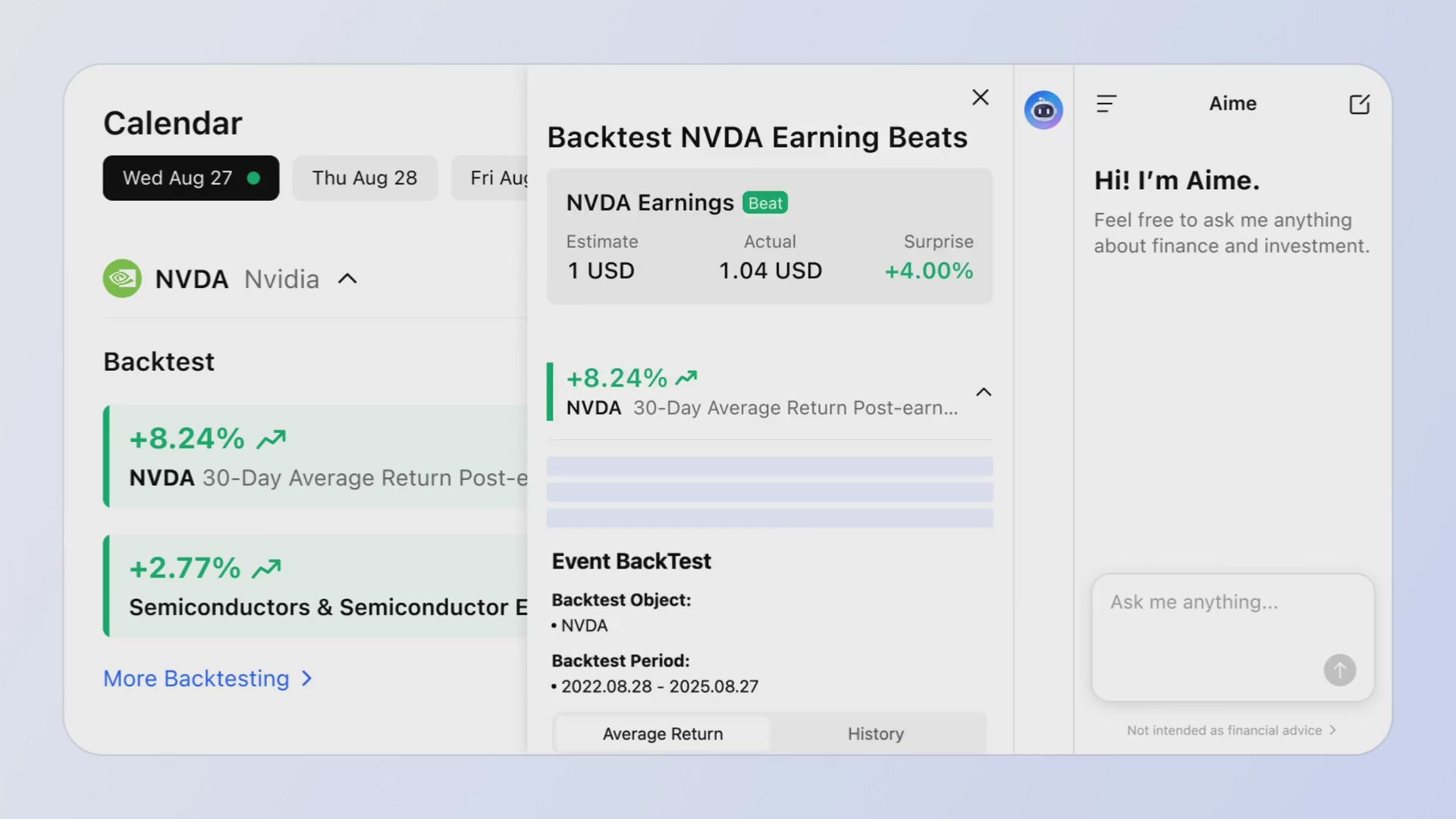 Enter a stock ticker (for example: AAPL, TSLA, NVDA) and click Analyze. Your report will appear on screen in seconds.